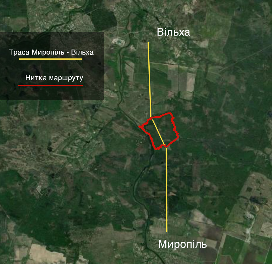 Річка буде по праву руку, за нею – поле, яке тягнеться до самої Вільхи, а ви будете йти красивим жовтезним лісом. Нікуди не звертайте й ідіть прямо, аж поки не вийдете на дорогу Миропіль – Вільха.