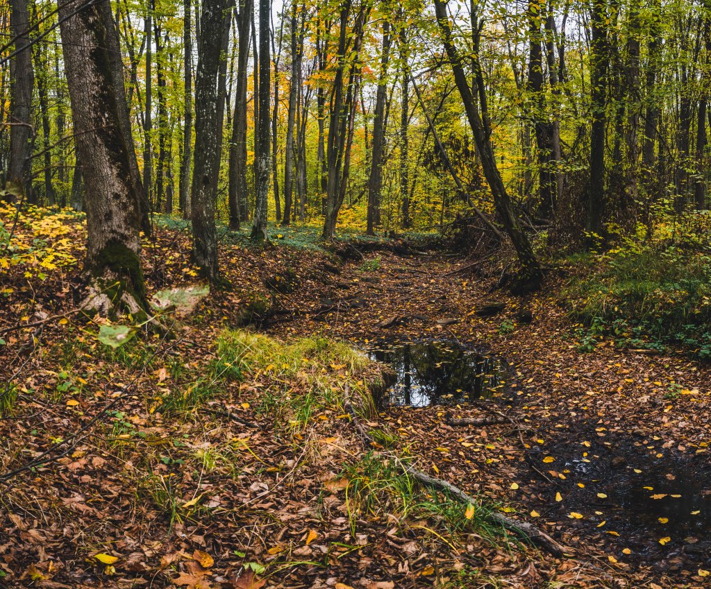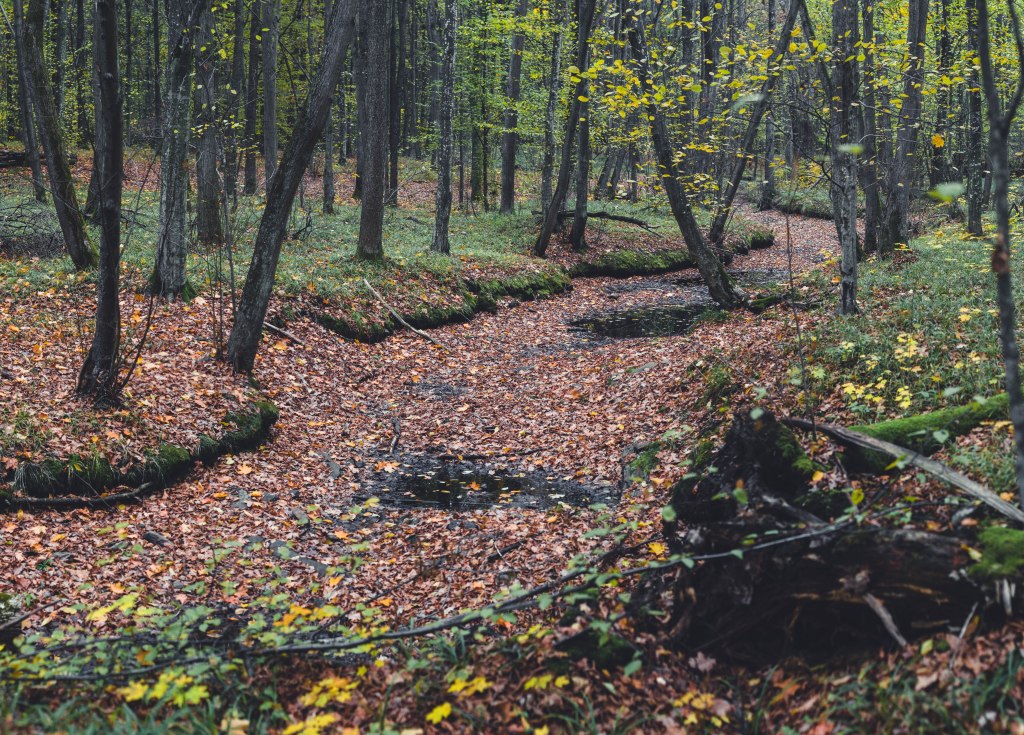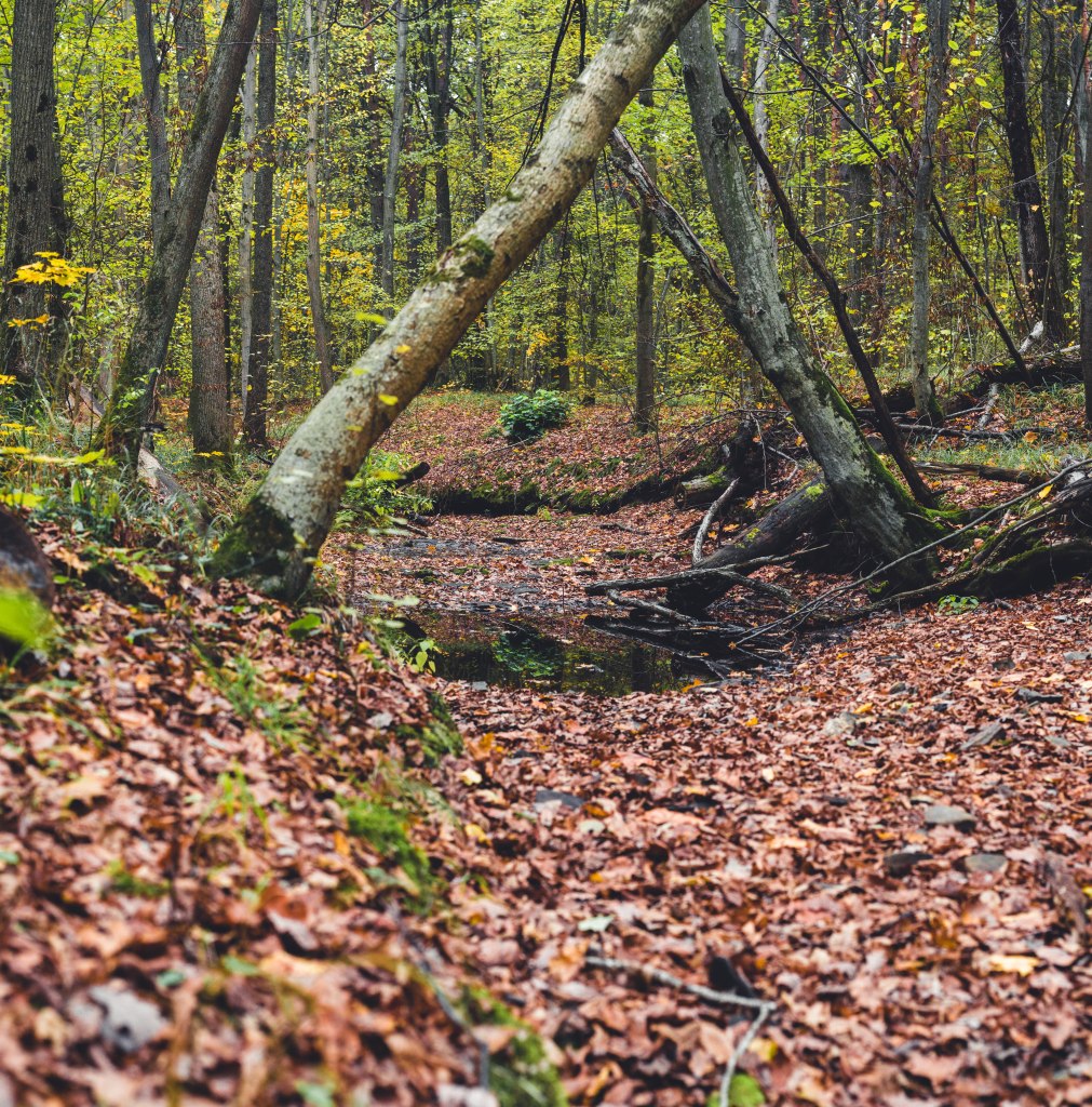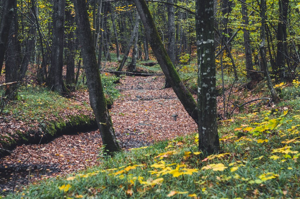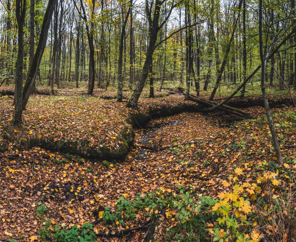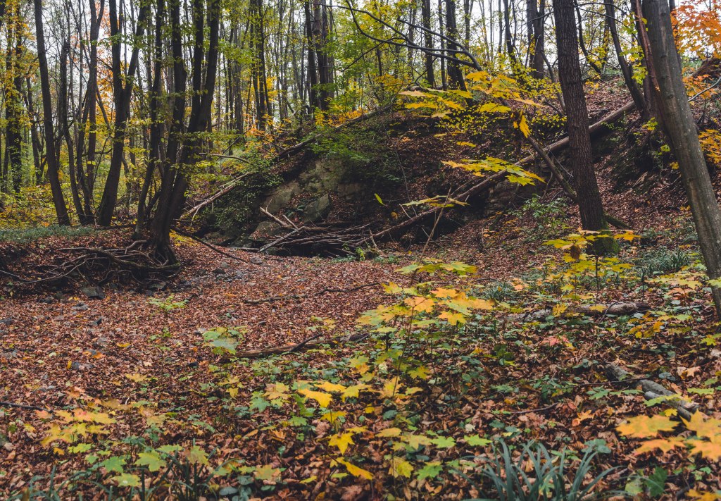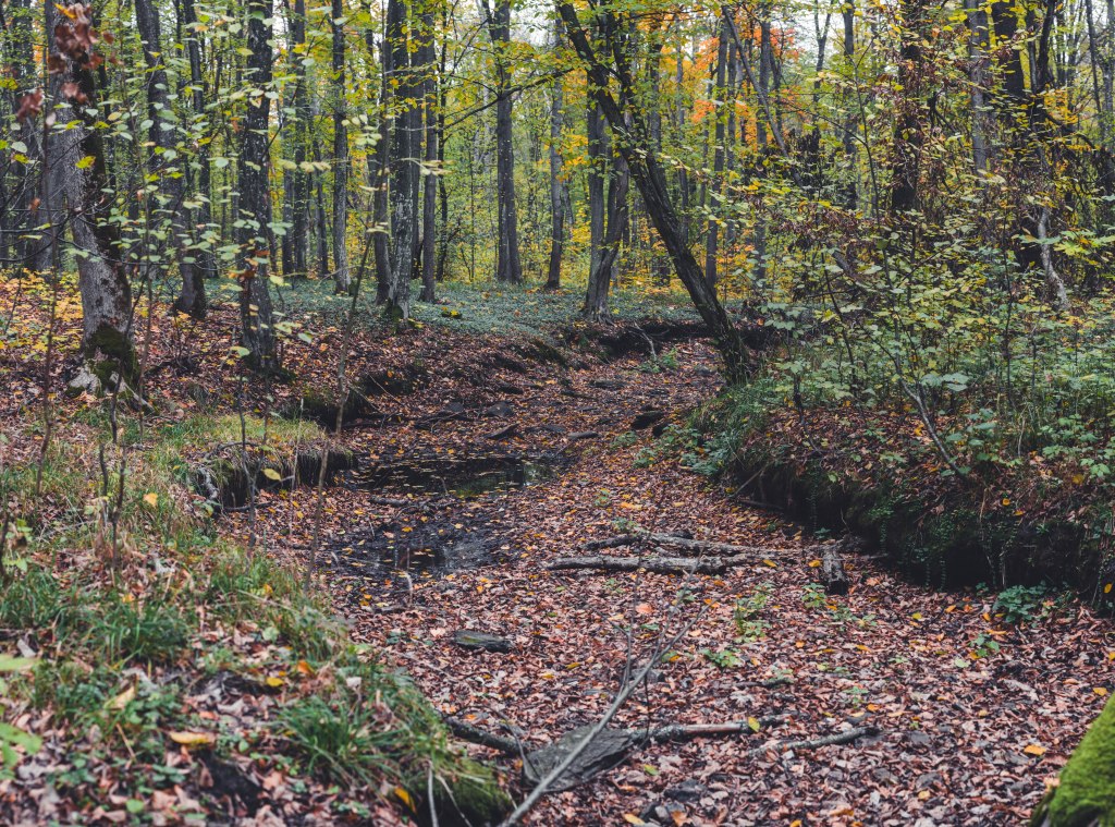 2. Жодних доріг! Дійшовши до мостика просто пірнаємо в самісіньку гущавину лісу і йдемо руслом річки Кам’янка. Так-так, прямо по дну річки, яке в осінню пору пересихає і дозволяє спокійно йти ним аж до відрізка №3.