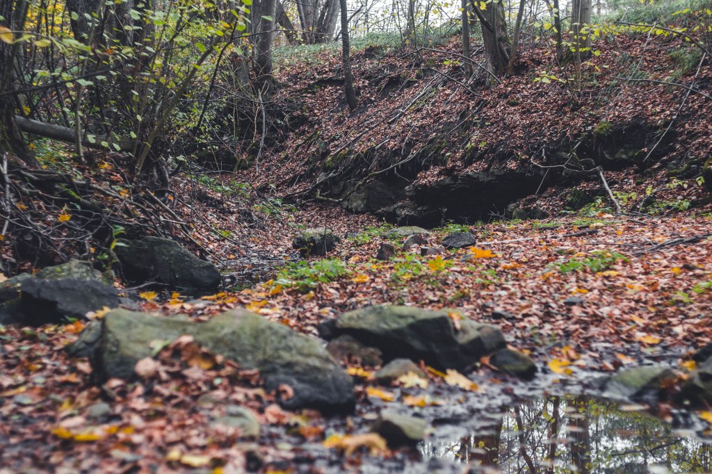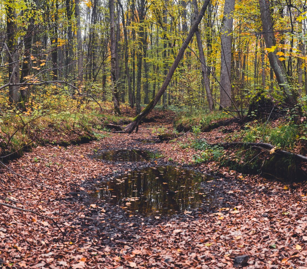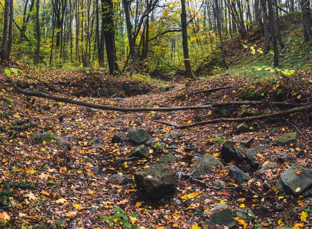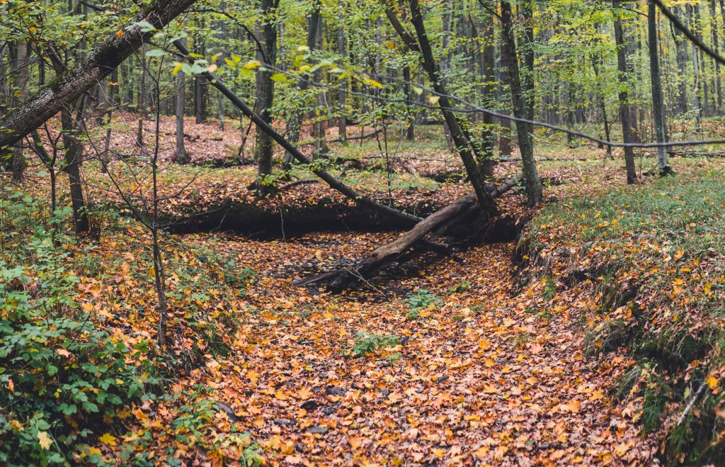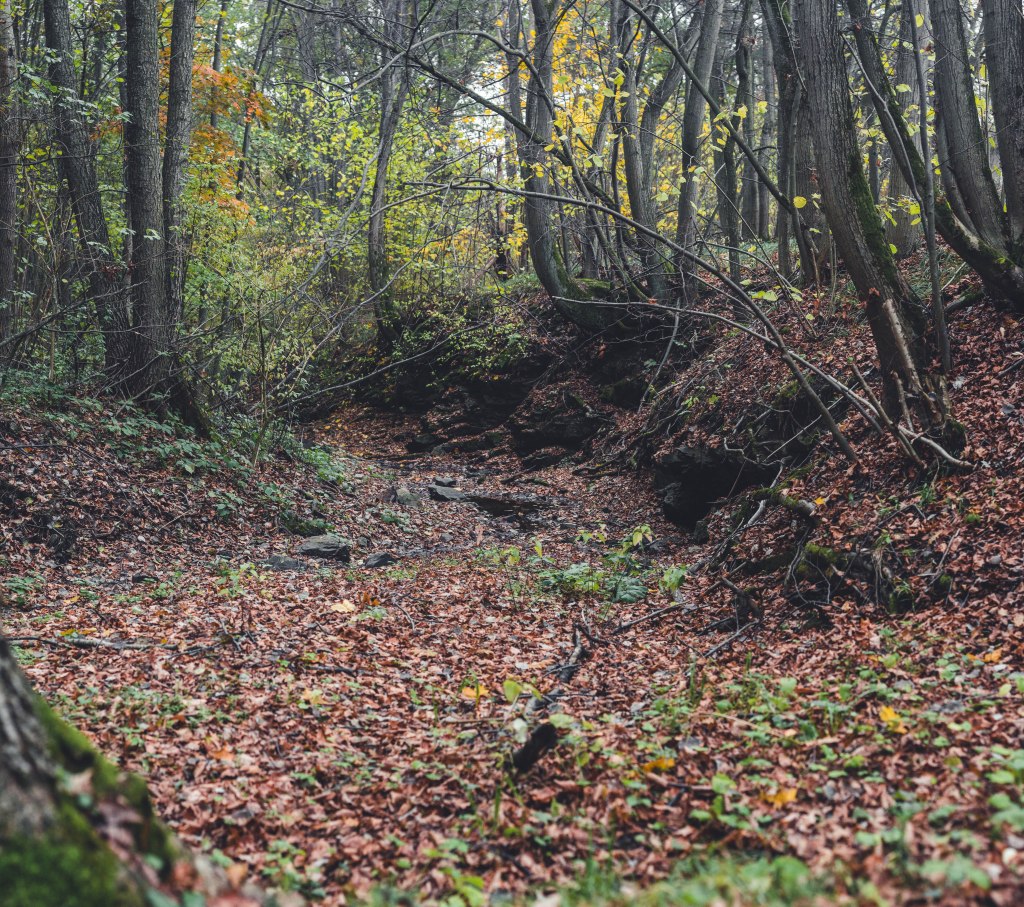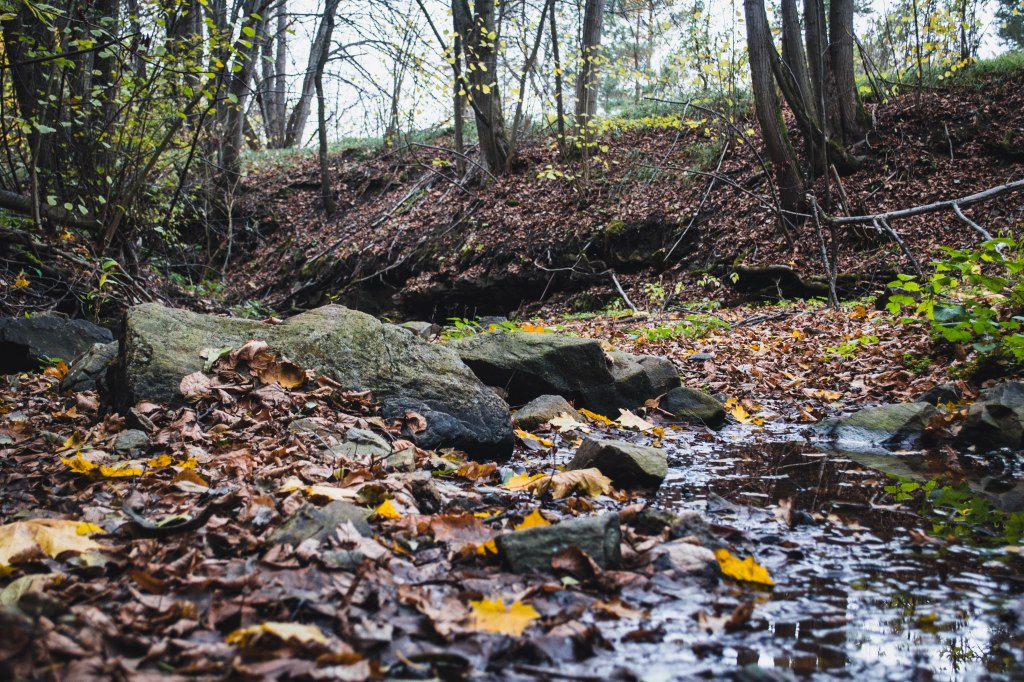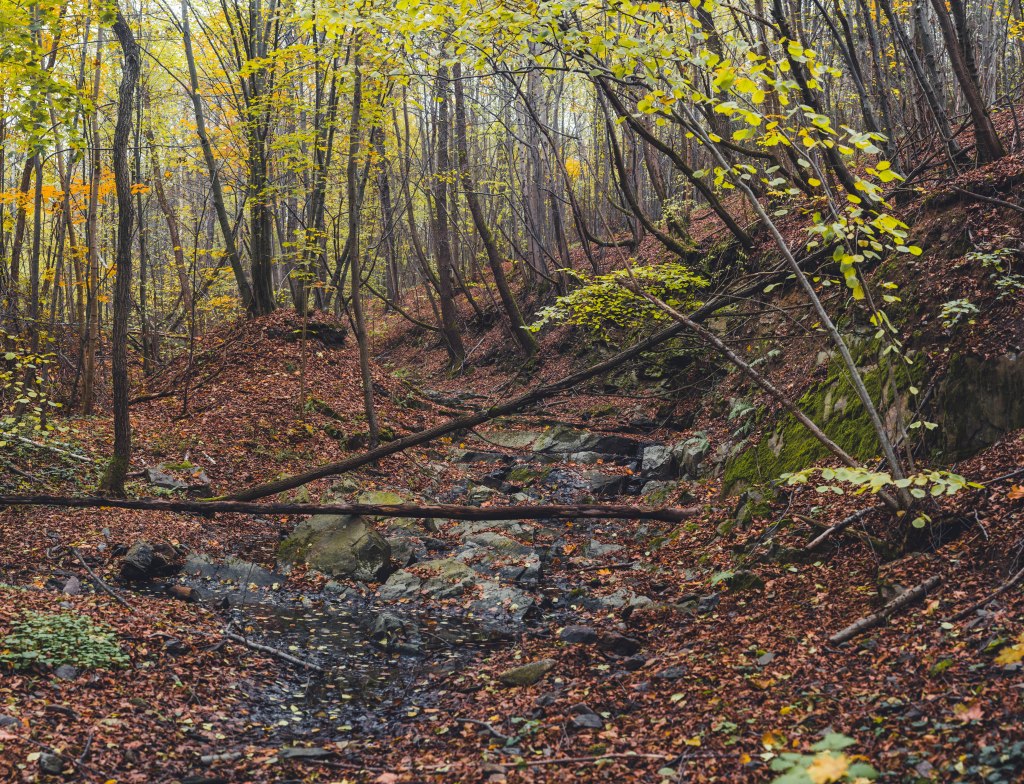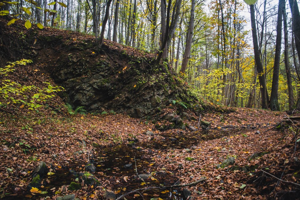 2. Жодних доріг! Дійшовши до мостика просто пірнаємо в самісіньку гущавину лісу і йдемо руслом річки Кам’янка. Так-так, прямо по дну річки, яке в осінню пору пересихає і дозволяє спокійно йти ним аж до відрізка №3.