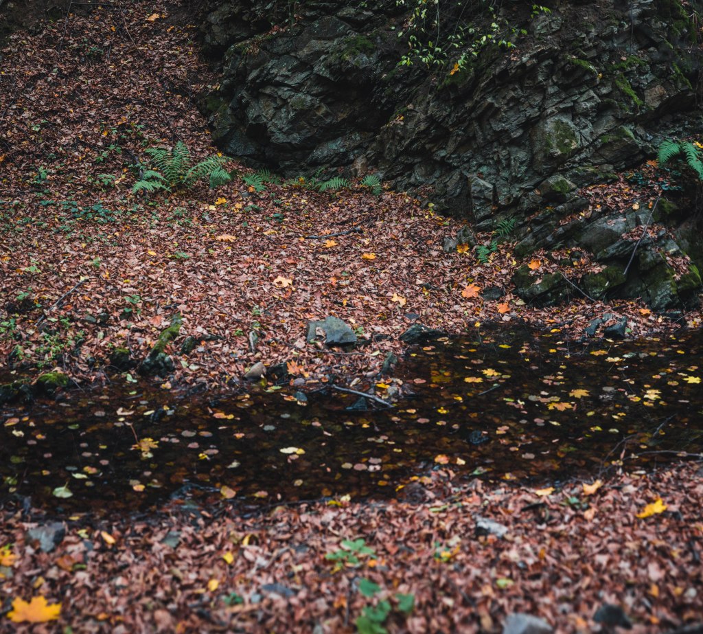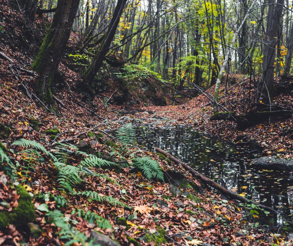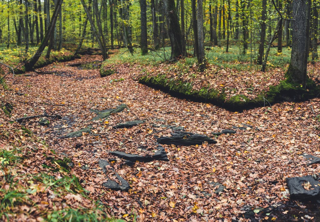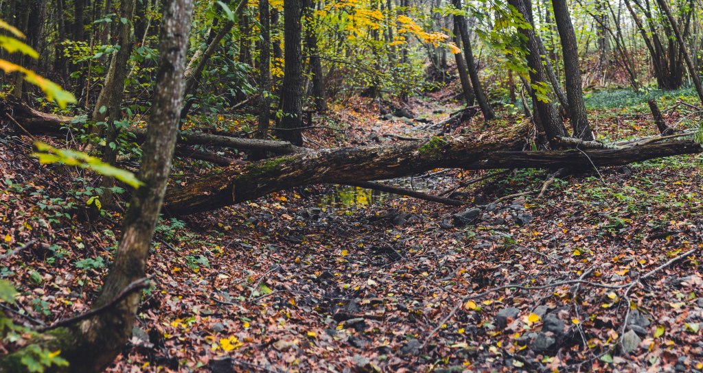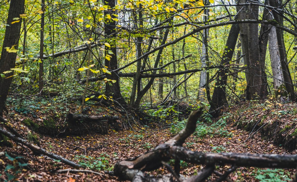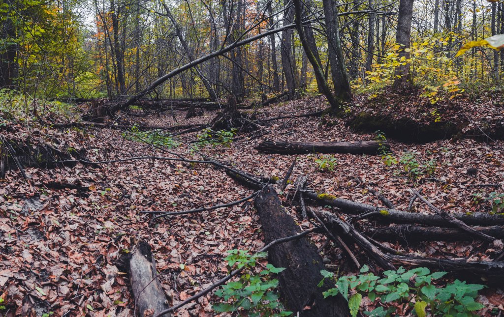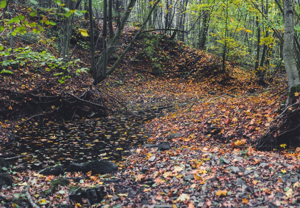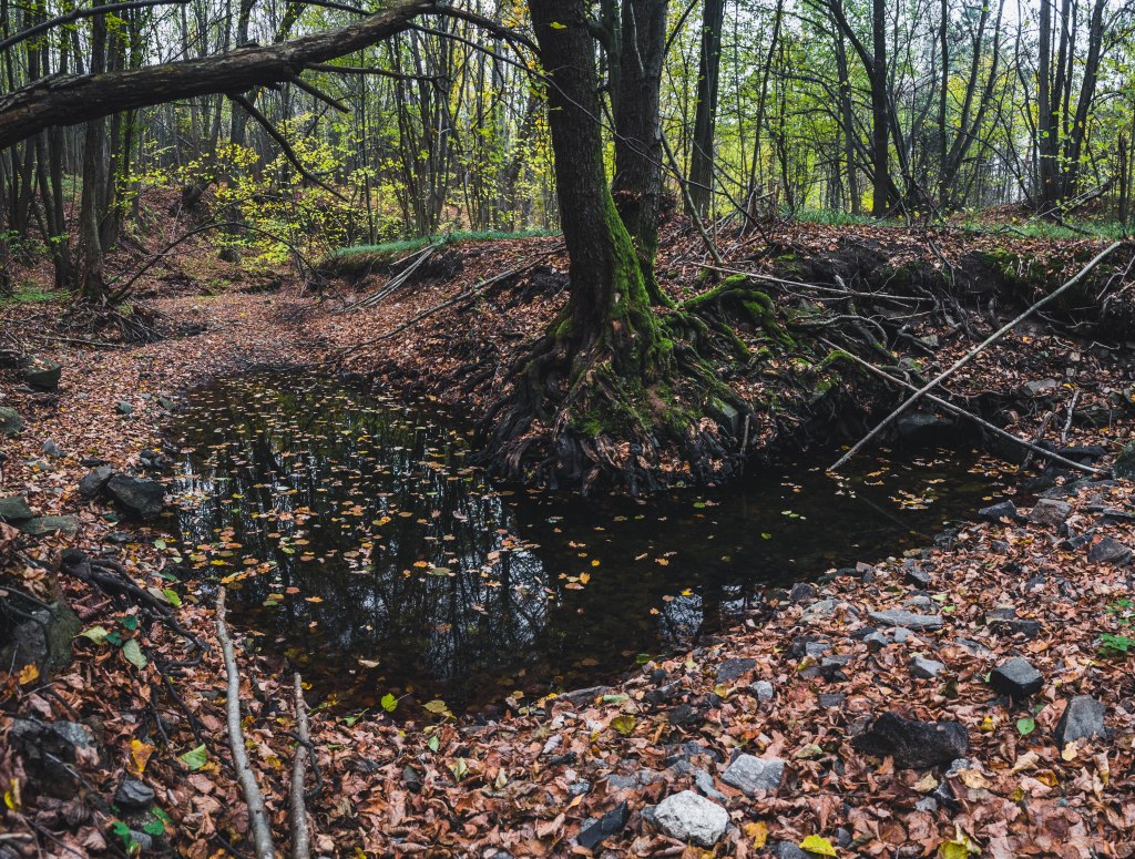 2. Жодних доріг! Дійшовши до мостика просто пірнаємо в самісіньку гущавину лісу і йдемо руслом річки Кам’янка. Так-так, прямо по дну річки, яке в осінню пору пересихає і дозволяє спокійно йти ним аж до відрізка №3.