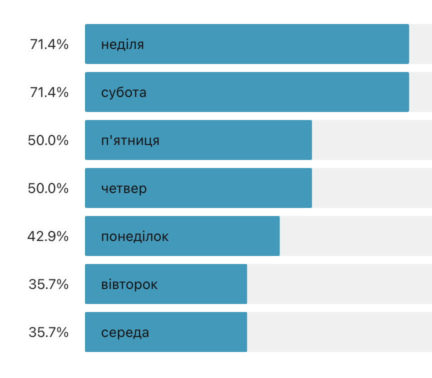 А ось тут доволі передбачувано. Більшість людей приходить в сквер у вихідні дні, а 50% – ще у другій половині тижня та у понеділок.