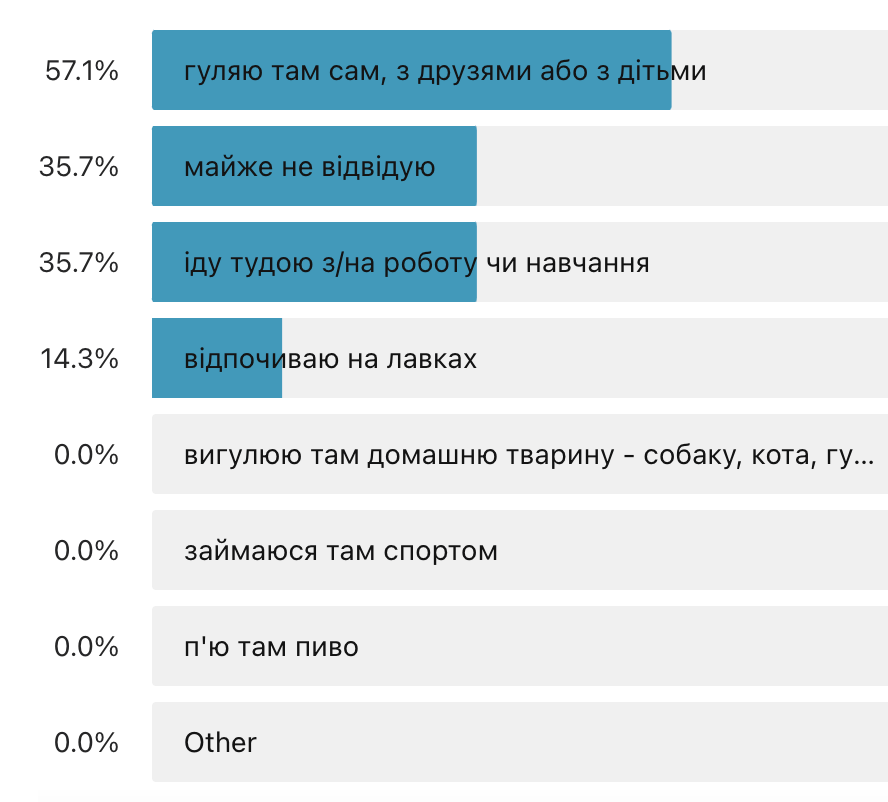 Зрештою, майже 60% опитаних просто там гуляють, ще 35% користуються сквером як транзитною зоною з дому чи додому.